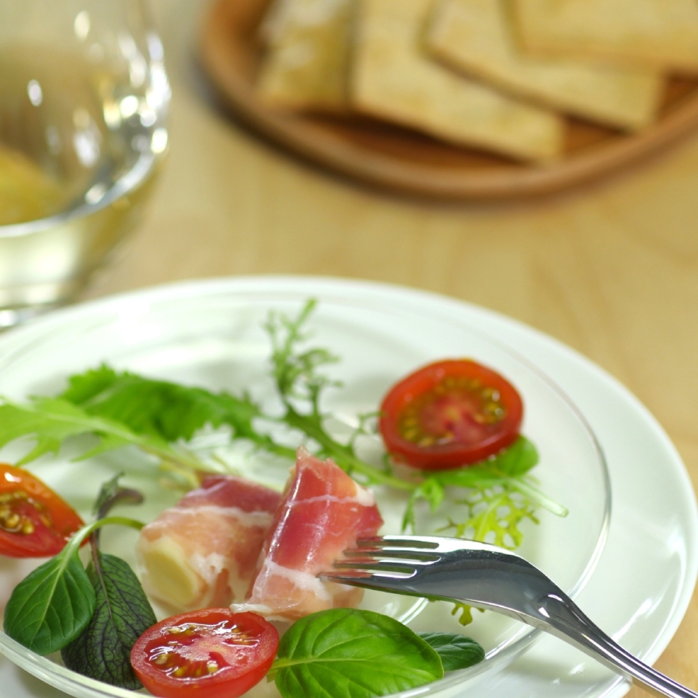 手でつまんで食べやすくカットしたひとくちサイズのカマンベール入りチーズを、スモークをきかせた生ベーコンで包みました。