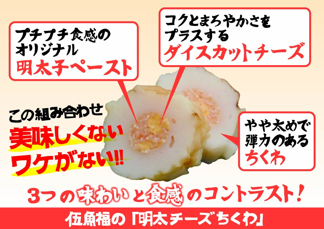 アゴだしの風味を効かせた特性だれで仕上げた明太子を、スケソウダラのすり身と合わせてペースト状にし、まろやかなコクのあるチーズと混ぜ合わせ、弾力のあるちくわに詰めました。