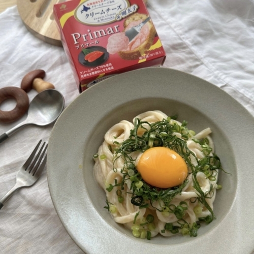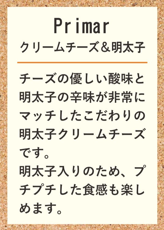 チーズの優しい酸味と明太子の辛みが非常にマッチしたこだわりの明太子クリームチーズです。明太子入りのため、プチプチした食感も楽しめます。
