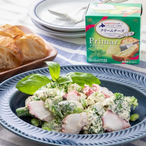 原材料名 プロセスチーズ(北海道製造)、クリーム、バジルペースト(バジル、植物油脂(大豆を含む)、食塩)、食塩/保存料(ソルビン酸K)