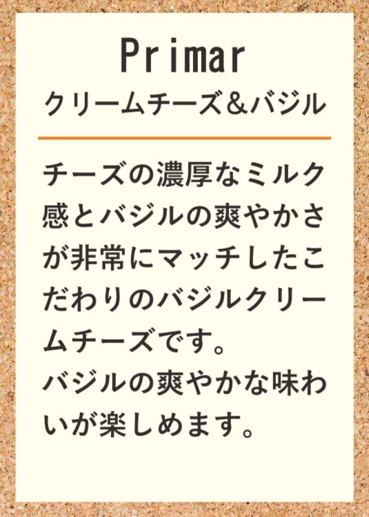 チーズの濃厚なミルク感とバジルの爽やかさが非常にマッチしたこだわりのバジルクリームチーズです。バジルの爽やかな味わいが楽しめます。