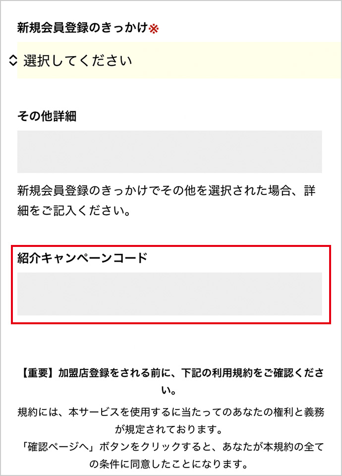 「紹介キャンペーンコード」入力欄に紹介元の加盟店コードと店舗名を入力してください。